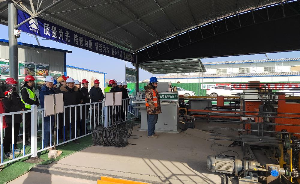 宋胜利一行重点察看了我司钢筋笼全自动智能化生产线作业情况。该生产线通过运用数字化控制技术,集成先进的大数据分析、人工智能算法以及机器人技术,实现了生产过程全自动化,大幅提高钢筋笼制作效率和质量,提升现场施工管理水平,为项目顺利实施提供了有力保障。宋胜利在调研检查过程中肯定了我司项目团队在精细化管理、项目进度控制、工程技术创新等方面做出的努力。