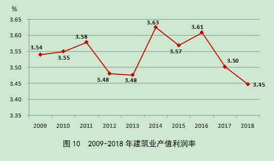 近10年来,建筑业产值利润率(利润总额与总产值之比)一直在3.5%上下徘徊。2018年,建筑业产值利润率为3.45%,比上年降低了0.05个百分点,连续两年出现下滑(图10)。