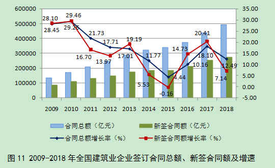 2018年,在以习近平同志为核心的党中央坚强领导下,建筑业深入学习贯彻习近平新时代中国特色社会主义思想和党的十九大和十九届二中、三中全会精神,改革创新,开拓进取,加快推动建筑业改革发展,建筑业发展质量和效益不断提升。全国建筑业企业(指具有资质等级的总承包和专业承包建筑业企业,不含劳务分包建筑业企业,下同)完成建筑业总产值235085.53亿元,同比增长9.88%;完成竣工产值120786.22亿元,同比增长3.42%;签订合同总额494409.05亿元,同比增长12.49%,其中新签合同额272854.07亿元,同比增长7.14%;房屋施工面积140.89亿平方米,同比增长6.96%;完成房屋竣工面积41.35亿平方米,同比下降1.33%;实现利润8104亿元,同比增长8.17%。截至2018年底,全国有施工活动的建筑业企业95400个,同比增长8.34%;从业人数5563.30万人,同比增长0.48%;按建筑业总产值计算的劳动生产率为373187元/人,同比增长7.40%。
