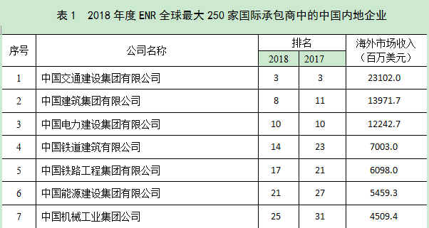 美国《工程新闻记录》(简称“ENR”)杂志公布的2018年度全球最大250家国际承包商共实现海外市场营业收入4824亿美元,比上一年度增长了3.1%,终止了持续三年的下滑趋势。我国内地共有69家企业入选2018年度全球最大250家国际承包商榜单,入选数量比上一年度增加了4家。入选企业共实现海外市场营业收入1141亿美元,比上年增长了15.6%,占250家国际承包商海外市场营业收入总额的23.7%,比上年提高2.6个百分点。
