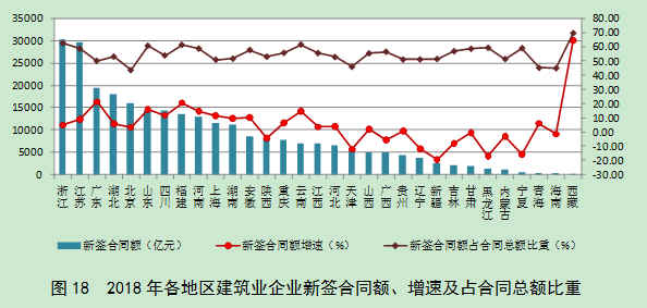 2018年,全国建筑业企业新签合同额272854.07亿元,比上年增长7.14%,增速较上年降低了13.27个百分点。浙江、江苏两省建筑业企业新签合同额继续占据前两位,分别达到30435.75亿元、29746.22亿元,占各自签订合同额总量的62.92%、58.91%,分别比上年增长了4.82%和8.95%。新签合同额超过1万亿元的还有广东、湖北、北京、山东、四川、福建、河南、上海、湖南等9个地区。新签合同额增速超过10%的有西藏、广东、福建、山东、云南、河南、四川、上海、安徽等9个地区,分别增长64.64%、21.33%、20.56%、15.98%、14.78%、14.75%、11.73%、11.39%、10.22%。11个地区新签合同额出现负增长,其中,新疆、黑龙江、宁夏的负增长超过了15%(图18)。