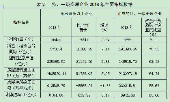 住房和城乡建设部汇总的6782个特、一级资质建筑业企业2018年主要指标数据如表2所示。从表中可以看出,上报数据的特、一级资质企业数量占比为7.11%,但新签工程承包合同额、建筑业总产值、房屋建筑施工面积、房屋建筑竣工面积和利润总额5项指标占全部资质以上企业同类指标的比重均超过55%,对行业发展的贡献明显。