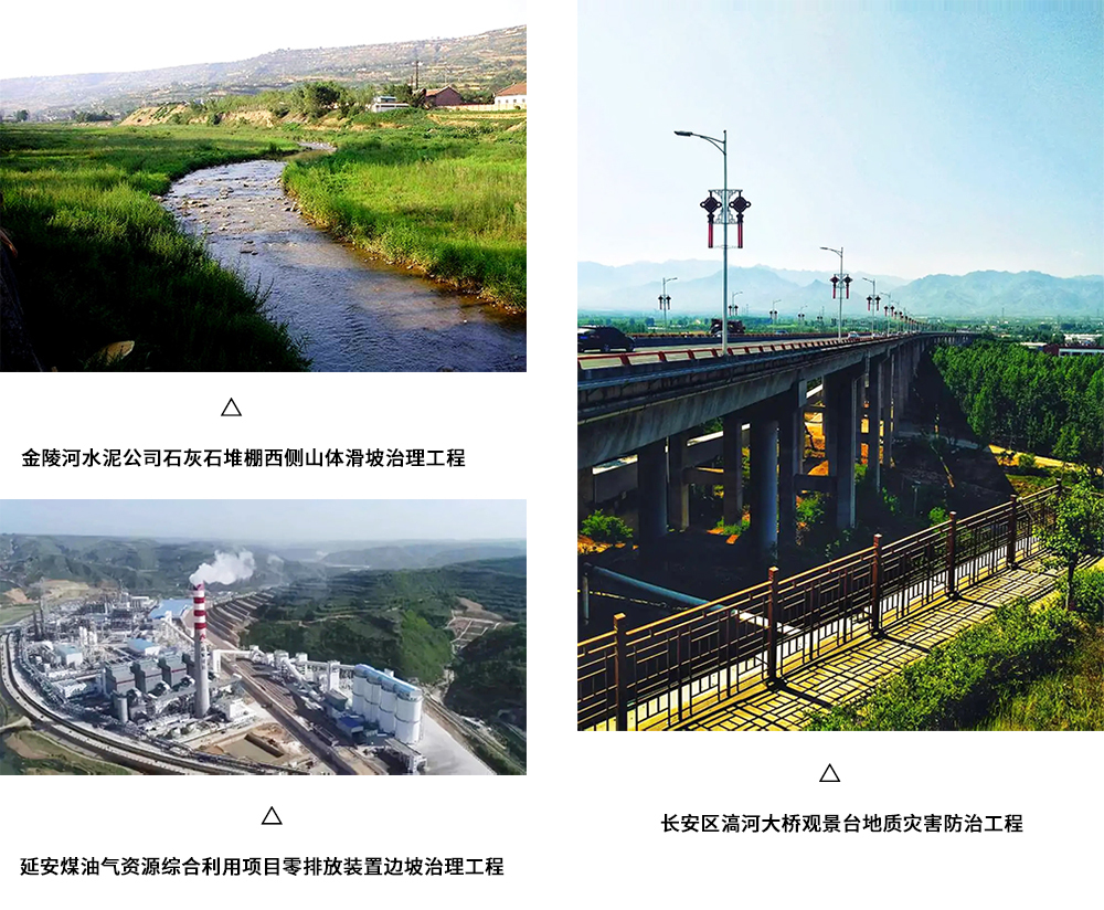 我公司业务涉及地质灾害治理方面,包含金陵河水泥公司石灰石堆棚西侧山体滑坡治理工程、西安市灞桥区洪庆野鸡胡二组/栗沟村二组崩塌治理工程、西安市临潼区铁炉街办南韩村南沟组崩塌治理工程、周至县竹峪镇民主村三组崩塌治理工程施工、下塬路及DN800给水管道地质灾害治理工程、延安煤油气资源综合利用项目零排放装置边坡治理工程、西安市灞桥区芙蓉小区东侧边坡治理工程、翠华山龙涎窝东侧边坡治理工程、长安区滈河大桥观景台地质灾害防治工程等项目。